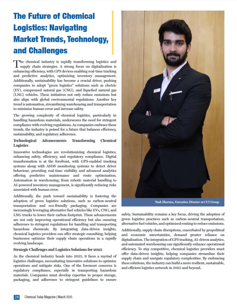 The chemical industry is rapidly transforming logistics and supply chain strategies. A strong focus on digitalisation is enhancing efficiency, with GPS devices enabling real-time tracking and predictive analytics, optimising inventory management. Additionally, sustainability has become a crucial driver, pushing companies to adopt “green logistics” solutions such as electric (EV), compressed natural gas (CNG), and liquefied natural gas (LNG) vehicles. These initiatives not only reduce emissions but also align with global environmental regulations. Another key trend is automation, streamlining warehousing and transportation to minimize human error and increase safety.